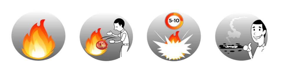 Once the Terminate Fire Safety Solution comes in contact with a direct naked flame, the Terminate Fire Safety Solution will self-activate and burst without any manual assistance, rapidly dispersing the dry chemical powder inside, onto a 360-degree radius covering 3 cubic meters. If used manually, simply roll or throw the ball into the fire.